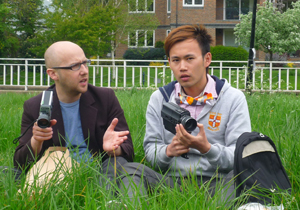 Jean and Cain discussing the pros and cons of spontaneous group filming in the green. | Kay is working on a flower animation to form her name. |