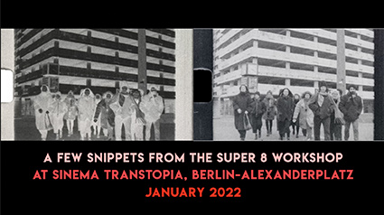 Super 8 ist ein extrem sexy Material: Es hat unschlagbare, tiefe Schwärzen, feine Grauwerte und warme Farbnuancen. Es ist geheimnisvoll unscharf, naturkörnig, nicht 100%ig planbar und kommt, wenn die Filmer*in ihre Antennen richtig ausfährt, ganz nah an das Geschehen ran. In einem Workshop an zwei Wochenenden könnt ihr mit Dagie Brundert lernen, euer Super8-Filmmaterial selber zu entwickeln – biologisch abbaubar mit Waschsoda, Vitamin-C-Pulver und etwas Phenolhaltigem: Kaffee, Tee, Pflanzensaft, Vanille, Unkraut, Rotwein, Kaffee, Baumrinde, Chili, roten Früchten, Thymian, Bier, Blumen, Kartoffeln, schwarzem Tee, Whiskey und vielem mehr! Als Inspiration dienen uns die gerasterte Fassade und die Architektur des Haus der Statistik sowie grafische Strukturen des Kinosaals und der Umgebung. Gefördert durch den Berliner Projektfonds Urbane Praxis Mehr Info hier SINEMA TRANSTOPIA bi’bakwerk arbeitet mit innovativen ortsbezogenen Vermittlungskonzepten, die auf eine gleichberechtigte Beteiligung und den Austausch von Ideen, Wissen und Kreativität zielen. Unsere Workshops sind generationsübergreifend und konzentrieren sich auf Themen, die sich aus der unmittelbaren Nachbarschaft ergeben. Danke fürs Mitmachen: Kun, Lisa, Malamatenia, Malve, Defne, Thais, Anna, Sara, Arjin, Nilra, Manying, Michelle, Judith, Vicky, Old Dog Noon